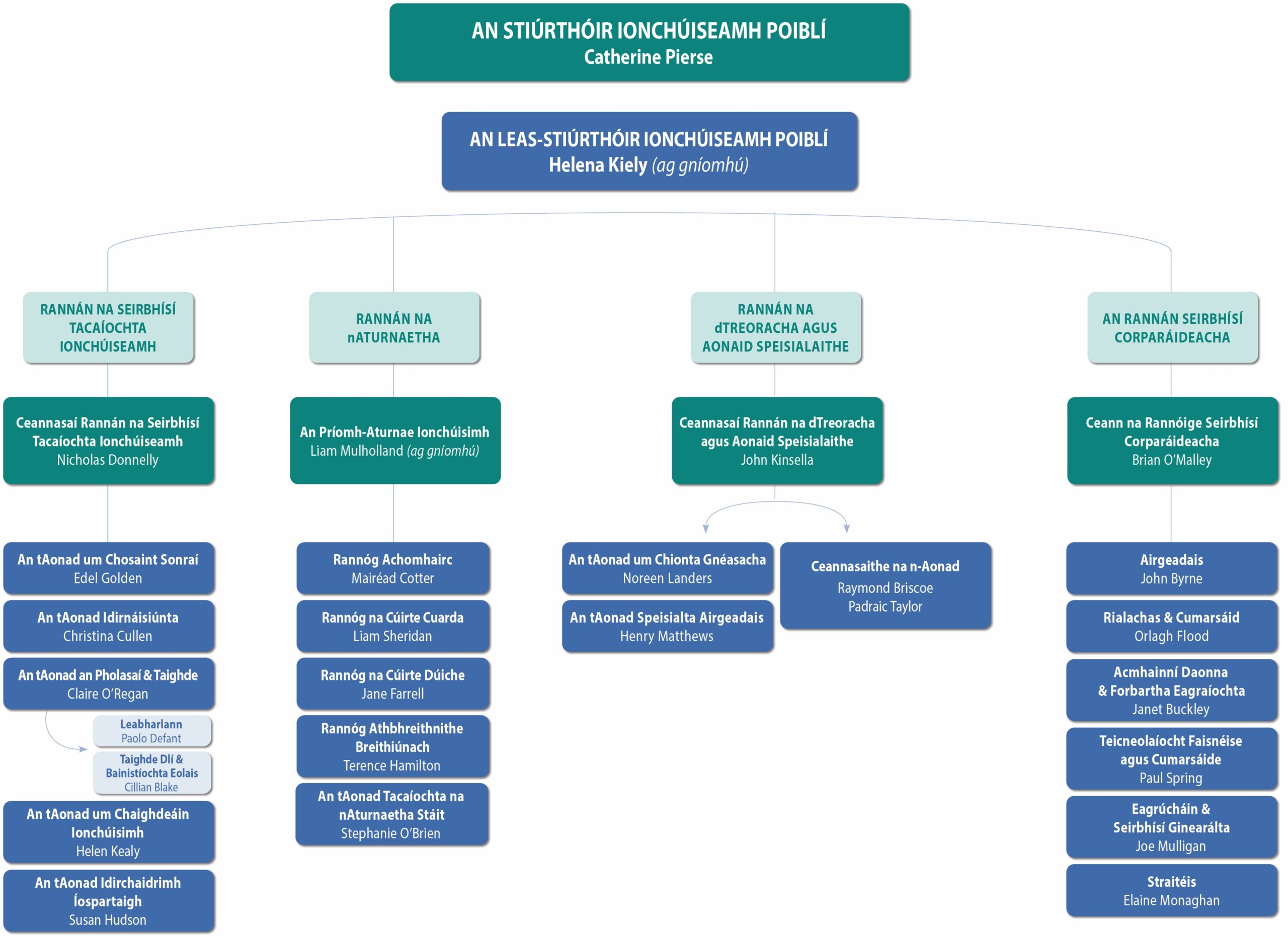 Le haghaidh léiriú amhairc ar ár gCairt Eagraíochta cliceáil anseo le do thoil.